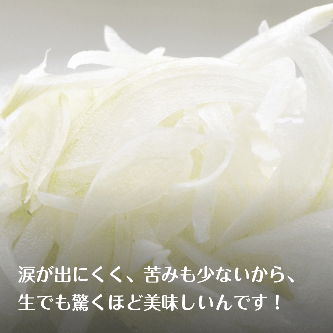 苦みが少ないため、生でも驚くほど美味しい玉ねぎです。シャキッとした食感とまろやかな甘みが特長で、水にさらす必要はありません。スライスして30分ほど置くだけで、自然と辛みが抜けて甘みがさらに引き立ちます。